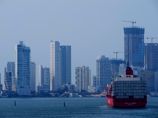 Die fast 20 stündige Fährfahrt von Colon in Panama nach Cartagena in Colombia ist angenehm ruhig. Die drei Restaurants an Bord sind nicht überteuert … auch mit unserer kleinen Kabine und eigenem Duschbad sind wir zufrieden. Am Nachmittag erreichen wir den Hafen von Cartagena … eine Hochhaus-Silhouette liegt vor uns.