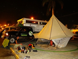 Um genau 18.00 Uhr schließen die Tore des Fährhafens … nur etwa die Hälfte unserer Fahrzeuge und Motorräder haben bis jetzt eine Fahrzeug-Versicherung. Fahren ohne Versicherung in Colombia ist nicht erlaubt … wir übernachten allesamt auf den Parkplätzen vor dem Hafengelände. Selbst auf dem Fußgänger-Überweg wird für die Nacht ein Zelt aufgebaut.
