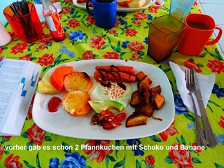 Chileman Victor ist am nächsten Morgen früh im Einsatz … organisiert die restlichen Versicherungen. Mit den Papieren in der Hand löst sich nach und nach unsere tolle Gemeinschaft auf … auch wir suchen uns einen Stellplatz in Cartagena. Eine Empfehlung für „big RV´s“ beim Hotel Pueblito stellt sich für uns mal wieder als Flop heraus. Nachdem Sigo unseren Pummel millimeterweise eingeparkt hat, erwartet der Besitzer des Hotels (Hostels) von uns eine Zimmerbuchung … 20 US$ pro Nacht und Person. Hm … unsere gute Laune ist erstmal gedämpft … hier aus der Parklücke fahren wir auf keinen Fall wieder rückwärts raus. Wir buchen und bezahlen für zwei Tage … benutzen tagsüber das klimatisierte Zimmer, Bad und Internet. Erst am nächsten Morgen legt sich die Stimmung … beim Breakfast inclusive.