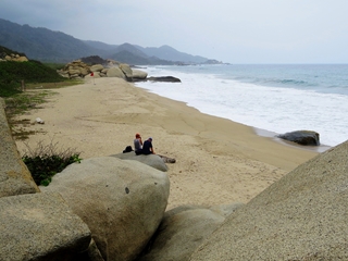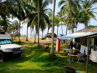 Nach drei Tagen wird unsere Idylle krachend zerstört. Eine 3 kg schwere Kokos-Nuss schlägt aus ca. 8m Höhe nur knapp zwei Meter neben Peter und mir (Hilu) in die Windschutzscheibe von Peters Camper ein. Ein Donner und Schlag … der uns Alle zum Nachdenken erschr(w)eckt. Wir packen die Zelte zusammen. Von Barbara und Urs verabschieden wir uns auf unbestimmte Zeit … mit Peter und Christa fahren wir für die nächsten Tage in den Parque Nacional Tayrona. Hier können wir auf dem Parkplatz des Parks übernachten … unternehmen wunderschöne Wanderungen durch den kolumbianischen Dschungel und bestaunen die gewaltige Brandung des karibischen Meeres.