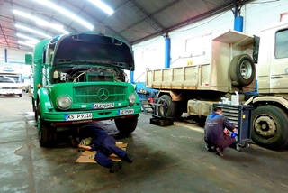 Auf dem Weg in die Hauptstadt Asuncion halten wir bei Halley-Mercedes … nach der Siesta bekommt Pummel einen Ölwechsel und die mitgebrachten Filter werden auch gleich ausgewechselt.