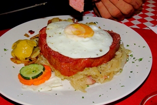 Zufrieden wagen wir uns im Feierabendverkehr durch die Stadt. Trotz Ampelanlagen ist der Verkehr total überlastet … die Straßen sind völlig verstopft. Wir landen im Hotel Westfalia. Nach einer riesigen Portion Leberkäse mit Sauerkraut und Röstkartoffeln im hauseigenem Lokal können wir unser Nachtquartier auf dem Hof hinter dem Restaurant aufschlagen. Für zwei Dollar pro Person stehen eigens für Übernachtungs-Camper warme Duschen zur Verfügung.
