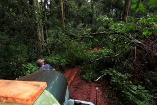 Vorbei an Rinderweiden geht es auf schlammiger und enger Piste in den Wald … hier kommen wir nicht weit. Der letzte, starke Regen hat einen Baum entwurzelt … dieser liegt mit der Krone direkt auf dem Pfad. Wozu gibt es eine Machete? Adam, der Sohn haut in Windeseile die dicken Äste ab … es geht weiter.