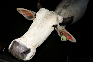 Wir sind durch … am gegenüberliegenden Ufer mal wieder ein Hindernis. Für mich ein unüberwindbarer Erdrutsch. Nicht für Ruben und seinen Oldy … nach ca. acht Versuchen ist er drüber. Wir stehen mitten auf der Jungviehweide … die Rindviehcher kommen neugierig angelaufen. Wir kommen uns vor wie auf einer Afrika-Safari ... nur daß diese Zebras keine Streifen haben.