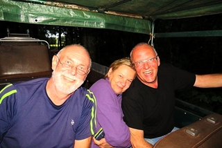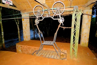 Kaum an der der anderen Uferseite angekommen, hören wir ein Zischen ... jetzt bloß keinen Plattfuß! Auch diesmal ist Adam wieder schnell zur rechten Stelle und erkennt das Problem. Ein Ast hat den Bremsschlauch abgerissen … wozu haben wir denn die Gänge und eine Handbremse? Unsere Fahrt geht oberhalb des Flußes weiter. Fast im Dunkeln erreichen wir einen Schuppen mit einer merkwürdigen Konstruktion ... einem handbetriebenen Velo mit Sitzgestell für die Flußüberquerung.