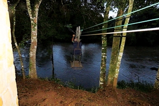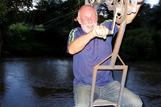 Selbstverständlich hat Ruben den Schlüssel für das Kettenschloss dabei … Sigo pedalt sich am Stahseil als Erster über den reißenden Fluß.