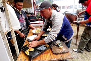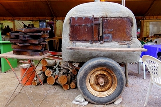 Empanadas gibt es mit verschiedenen Gemüse- und Fleischfüllungen … gebacken werden sie in den mit Wurzelholz befeuerten Lehmöfen. Eigens für die Gewerbeschau sogar in einem fahrbaren Lehm-Backofen.
