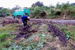 Hm … 16.00Uhr … es wird bald dunkel. Wortlos weiß Jeder von uns was jetzt zu tun ist. Am Strassenrand buddeln wir Steine aus … Spaten und Unterleghölzer werden ausgepackt. Wir müssen uns beeilen … hier zu übernachten, haben wir Beide keine Lust. Durch das Hin- und Herlaufen beim Steineschleppen wird die Straße immer rutschiger … Strohmist und Zuckerrohrabfälle dienen als Packlage. Jeder Versuch, unseren Pummel aus der Knätsche rauszufahren, macht die Spuren nur noch tiefer. Die Räder blockieren und unser Pummel rutscht in die Löcher zurück. Viermal machen wir das Spielchen, die tiefen Löcher wieder aufzufüllen. Endlich genug Grip … eingesaut und voll mit Schlamm stehen wir nach zwei Stunden wieder auf der Strasse.