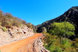 Um die Fahrt bis Salta für uns interessanter zu machen, nehmen wir eine, in der Karte sehr kurvenreiche Piste von ca. 60km, in Angriff. Bei Juramento biegen wir von der RN9 ab … feste, staubige Schotterstraße ist angesagt. Trockenes Buschland, immer mehr Kakteen bestimmen das Landschaftsbild … unser Pummel glänzt schon lange nicht mehr. Wir nehmen an Höhe zu … heute erreichen wir die ersten 1.000m. Nach der Hälfte der Strecke gibt es eine Gabelung … direkt nach Salta oder zum Lago Cabra Corral. Trotz Hinweis auf eine tiefe Flussdurchquerung entscheiden wir uns für die kurvenreiche Strecke entlang des Rio de las Piedras ... es wird eine wunderschöne Fahrt durch eine grandiose Schlucht.