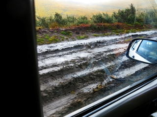 Die Schlammspuren sind mindesten 50-60cm tief ... die Straße kaum breiter als das Auto, auf einer Seite geht es immer steil runter. Inzwischen sind wir auf 3.500 Meter Höhe … der Wind nimmt zu, so daß wir nicht einmal das Fenster öffnen können.