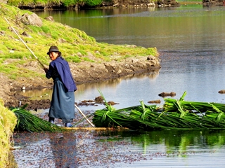 Spontan helfe ich einer alten Frau … sie paddelt mit einer dünnen Baumstange ihr primitives Bambusfloss über die Lagune. Vollbeladen mit schweren Schilfbündeln, die sie auf dem See mit einem Messer geschnitten und gebündelt hat, ohne dabei ins Wasser zu fallen, kommt sie ans Ufer. Zuerst ist sie misstrauisch, als ich Ihr meine Hilfe anbiete … dann nimmt sie diese dankend an. Die Bunde sind schwer … schätzungsweise 30kg pro Paket.
