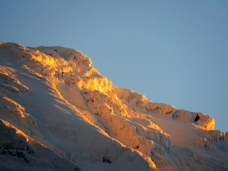 Langsam gehen wir die letzten Meter zum Refugio. Die Luft ist dünn … wiedermal fällt das Atmen sehr schwer. Wir bleiben ca. eine Stunde oben. Immer wieder verändert sich die Sicht und das Wetter … für uns ein Grund, nicht hier oben im Parque Nacional zu übernachten. 9 km wieder zurück besuchen wir in einem winzigen Dorf das Hostel Condor Huasi (Tipp von Stefan im I-Overlander). Hier stehen wir mit Blick auf den vor uns liegenden Chimborazo … angestrahlt von der untergehenden und aufgehenden Sonne.