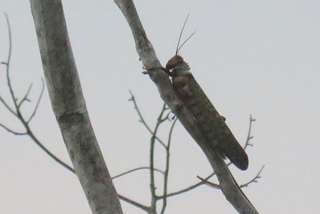 Eine besondere Entdeckung machen wir bei einer P....lpause. Während ich auf Sigo warte … sehe ich in ca. 30-35m Entfernung auf einem kahlen Baum eine riesige Heuschrecke. Ich traue meinen Augen nicht … diese Heuschrecke muß mindesten 40-50 cm lang und 10cm im Durchmesser dick sein. Zumindest ist sie so dick wie der Ast, auf dem sie liegt. Gut, daß der Baum keine Blätter mehr hat, vielleicht gefressen von der Heuschrecke … wir hätten dieses Monster niemals gesehen.
