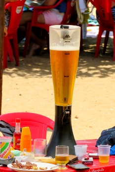 Da wir keine Vorbuchung haben, suchen wir die Räumlichkeiten am Vormittag schon einmal auf. Es liegt nur 1,5 km vom Stellplatz entfernt … zu Fuß schnell erreicht. Hm … die „Bude“ hat zu … kein Hinweis auf eine Abendshow. Wir fragen den Taxifahrer gegenüber, wir fragen den Kiosk-Besitzer nebenan. Sie Beide bestätigen uns, daß es jeden Abend eine Vorführung gibt. Am besten sollten wir erst nach 21.00 Uhr wiederkommen. Punkt 21.00 Uhr sind wir zurück … die Bilheteria hat auf und wir haben als die ersten Besucher freie Sitz-Auswahl. Wir lassen uns vom Kellner ein paar kalte Bierchen an den besten Platz bringen … erleben eine Super-Show mit Sambatänzen, Live-Musik und Wahnsinns- Kostümen und Figuren.