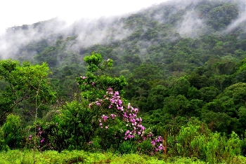 Wir bummeln weiter durch die säumende Berg-Landschaft … lila blühende Clematisbäume sind ein wunderschöner Farbtupfer in dem teilweise vernebelten Regenwald.