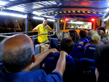 Wegen eines drohenden Gewitters verschiebt sich die Fahrt um ca. 1 Stunde. Alles ist gut organisiert … im offenen Doppeldecker-Bus (6 gesamt) geht es an die Sperrmauer.