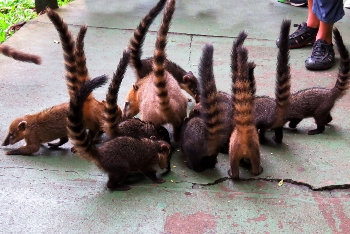 Gut organisiert bringen die Park-Busse die Touristen zu der „Pista Mirante“. Begrüßt werden wir hier von den freilaufenden Quatis (Nasenbären). Achtung! Hier ist allergrößte Vorsicht geboten … so niedlich wie sie aussehen, sind sie nicht. Verwöhnt durch das „Fotofüttern“ der vielen Touristen greifen sie Mensch und Handtaschen an. Wir beobachten, wie sich innerhalb von Sekunden mehrere der Quatis sehr aggressiv auf einen Plastikbeutel einer jungen Frau stürzen (Inhalt: Camera und Brötchen).