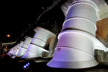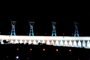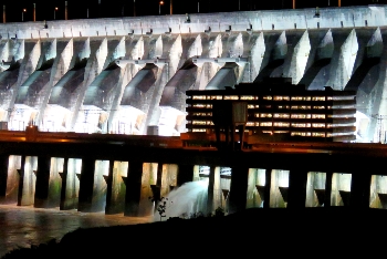 Das Kraftwerk Itaipu … bezüglich der Leistung noch immer das größte Kraftwerk der Erde, ist ein Gemeinschaftsprojekt Paraguays und Brasiliens. 2006 wurde es größenmäßig von dem Drei-Schluchten-Stausee in China an die zweite Stelle verdrängt. Begonnen wurde der Bau in 1974, in 1982 gingen die ersten Turbinen ans Netz ... in 2005 wurde mit der 20.Turbine der Bau vervollständigt. Leistungen, wie Megawatt, Terrawatt und Gigawatt sind für uns unvorstellbare Zahlen. Wir sind über die bauliche Größe erstaunt … mit fast 8km Länge und und einer Höhe von 196 m ist wirkt die angestrahlte Staumauer bei Nacht einfach nur gigantisch.