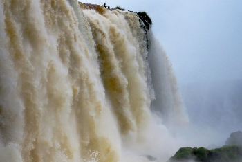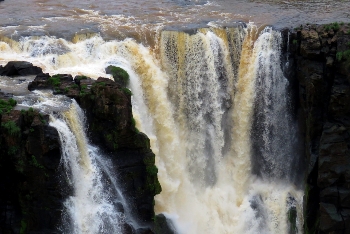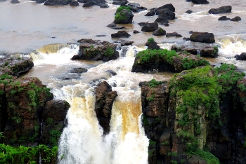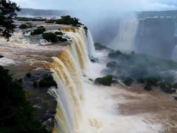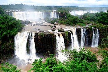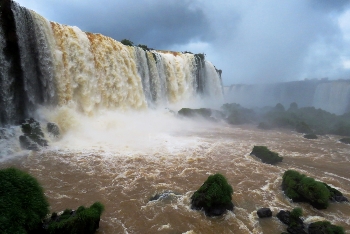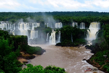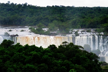 Eingebettet wie ein Juwel liegen die Wasserfälle in tiefstem Regenwald an dem Grenzfluß Iguacu zwischen Argentinien und Brasilien. Über eine Breite von 2.700m stürzen die Wassermassen mit ohrenbetäubendem Lärm bis zu 80m in die Tiefe. Die meisten der 275 einzelnen Fälle liegen auf der argentinischen Seite … somit haben wir von der brasilianischen Seite den größeren Panoramablick.