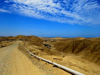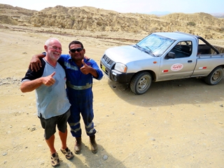 Wir verlassen Lobitos … folgen einer Wegbeschreibung zur Panamericana. Die staubige Piste führt uns über die Minenfelder der Ölgesellschaft. Ein Kontrollposten schreibt die Fahrzeugnummer auf … wir dürfen passieren. Die Anfangs einzige Straße entwickelt sich zu einem Spinnennetz. Kein Problem. Ein Minenarbeiter sieht uns … fährt mit seinem Pick-Up ca. 15 km voraus. Der Fahrer freut sich, daß er uns helfen konnte … auch wir haben uns über diesen netten Einsatz sehr gefreut.