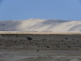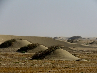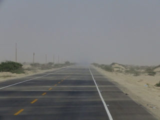 Die weitere Strecke führt uns durch scheinbar unendliche Wüstenlandschaft … diesmal liegen rechts und links der Straße riesige, helle Sanddünen. Auch ein kleiner Sandsturm kommt auf.
