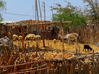 Die Bewohner der wenigen, kleinen Dörfer leben ständig mit diesem Wind und Staub. Sie schützen ihre Häuser und Stallungen mit aufgestellten Zäunen, die sie aus Blechen, Plastik und Reisig gebaut haben.