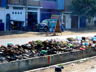 Auch die von hier ca. 40km östlich gelegene archäologische Stätte von Sipan wollen wir besuchen. Um dort hin zu kommen, müssen wir erst einmal durch die Stadt Chiclayo. Die Straßen durch die Innenstadt sind laut GPS breite Durchfahrtsstraßen. Wir sind geschockt … jedoch nicht über den vielen und lauten Verkehr. Unglaublich … mitten in der Stadt wird der gesamte Müll entsorgt. Wir sehen, wie der Müll eines Geschäftes, einfach vor der eigenen Haustür entsorgt wird. Ein kleiner Kanal verläuft durch die gesamte Stadt … rechts und links häuft sich die Müll-Entsorgung.