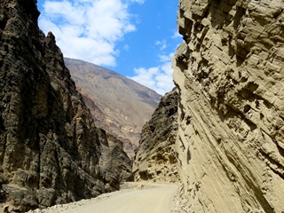 Einige unbeleuchtete Tunnel haben wir bereits durchfahren … doch die eigentliche Tunnelstrecke durch das Canon del Pato mit 35 Tunneln haben wir noch vor uns. Die beginnt kurz nach Huallanca. Genau hier heißt es jetzt die Daumen drücken … Gegenverkehr wäre sehr unangebracht. Ein paar steile Kurven geht es einspurig hoch hinauf … ohne Leitplanken. Der Blick hinunter in die Schlucht ist schon gewöhnungsbedürftig.