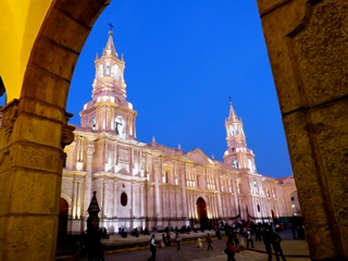 Arequipa … fast 850.000 Einwohner. Vor ein paar Jahren erklärte die UNESCO den kolonialen Stadtkern zum Weltkulturerbe. Auf einer angenehmen Höhe von 2.300m ist die Stadt umgeben von 5.000 bis über 6.000 Meter hohen Vulkanen. Nur recht selten sind die Vulkane unter dem permanenten Dunst von Arequipa klar zu erkennen. Die weiße Stadt … diesen Namen verdankt sie dem weißen Tuffstein, den der Vulkan Misti vor Jahr Millionen als Asche ausgespuckt hat. Aus diesem weißen Tuffstein sind viele der Gebäude in Arequipa gebaut. Auch die große Catedrale am Plaza de Armas.