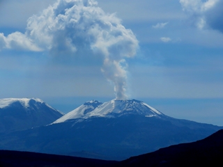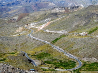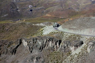 Auf dem Stellplatz am Hostal las Mercedes ist es inzwischen voll geworden … Safari-Tours, Rotel-Tours und eine französische Familie sind heute Nachmittag eingetroffen. Nach drei Nächten brechen wir wieder auf … wir sind auf der Suche nach den Anden-Condoren. Bis zum Canon de Colca sind es ca. 200km. Wir verlassen Arequipa ... es geht ständig bergauf. Heute haben wir eine ganz gute Sicht auf die umliegenden Vulkane. In weiter Ferne können wir den Stratovulkan Sabancaya in voller Aktivität erkennen.