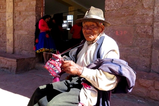 Mit dem Motorboot geht es anschließend fast 2 ½ Stunden weiter zu der Isla Taquile. Die Armut der hier lebenden Inkas hat die Menschen zusammen geweißt … sie leben von Web- und Strickarbeiten ... die Webgenossenschaft wurde auch von der UNESCO zum Weltkulturerbe ausgezeichnet. Hier auf der Insel werden die Strickarbeiten auch von den Männern ausgeführt. Ein ungefähr 95 jähriger Inselbewohner strickt noch immer die detaillierten Muster mit fünf Nadeln für eine der bekannten Inka-Mützen.